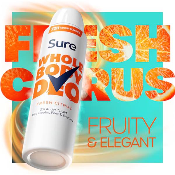 Sure Whole Body Deo Fresh Citrus for women features a fresh and citrus fragrance with a classic, feminine feel.